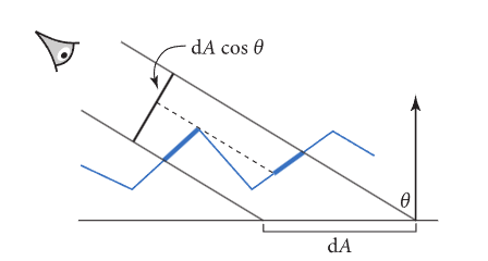 在上面的分析中提到,微平面理论有一个前提,所有微平面在宏观法线上的投影面积与宏观平面相等,然而在现实中,观察的方向与宏观法线的方向往往是不一致的,如下图所示: