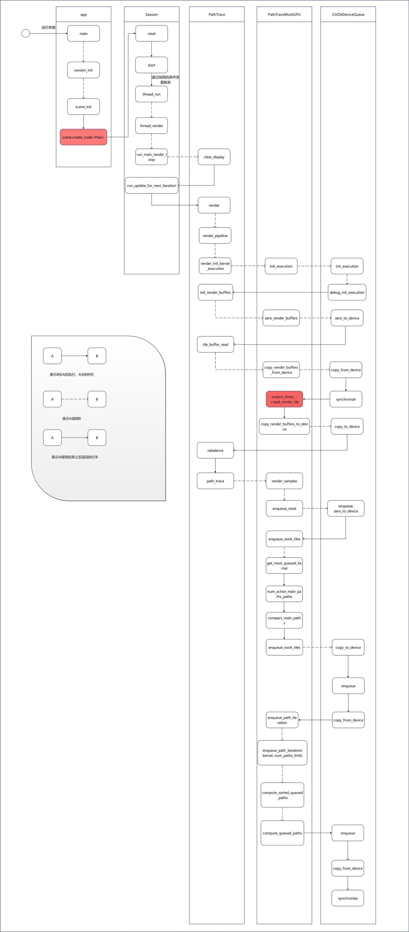 这里以CUDA设备为例,执行一次渲染主要涉及APP端,Session,PathTrace,PathTraceWork和DeviceQueue几个类,PathTrace,PathTraceWork属于Host侧的调度算法,DeviceQueue负责Host和Device的交互,它会在Device上调用对应的渲染算法。渲染期间设计的模块远不止这几个,比如场景的管理,Device设备的抽象,PathTraceWork的生成,这里只列举主要的模块,讨论Cycles在执行一次渲染中执行了哪些过程。